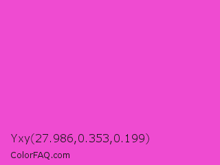 Yxy 27.986,0.353,0.199 Color is a light magenta color and the nearest color is Purple Pizzazz #fe4eda. Hex code #ef4bd1 and RGB value is rgb(239,75,209). In RGB color space, this color is composed of 94% red, 29% green, 82% blue, In CMYK color space, this color is composed of 0% cyan, 69% magenta, 13% yellow , 6% black , In HSL color space, this color has a hue angle of 311° , 84% saturation and 62% lightness.
