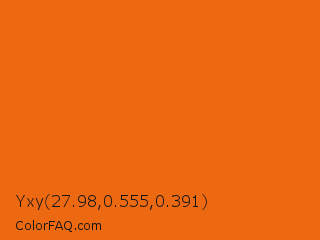 Yxy 27.98,0.555,0.391 Color is a normal orange color and the nearest color is Christine #e7730a. Hex code #ec6912 and RGB value is rgb(236,105,18). In RGB color space, this color is composed of 93% red, 41% green, 7% blue, In CMYK color space, this color is composed of 0% cyan, 56% magenta, 92% yellow , 7% black , In HSL color space, this color has a hue angle of 24° , 86% saturation and 50% lightness.