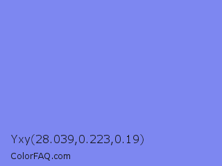 Yxy 28.039,0.223,0.19 Color is a light blue color and the nearest color is Chetwode Blue #8581d9. Hex code #7d87f1 and RGB value is rgb(125,135,241). In RGB color space, this color is composed of 49% red, 53% green, 95% blue, In CMYK color space, this color is composed of 48% cyan, 44% magenta, 0% yellow , 5% black , In HSL color space, this color has a hue angle of 235° , 81% saturation and 72% lightness.