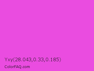 Yxy 28.043,0.33,0.185 Color is a light magenta color and the nearest color is Purple Pizzazz #fe4eda. Hex code #ea4ce0 and RGB value is rgb(234,76,224). In RGB color space, this color is composed of 92% red, 30% green, 88% blue, In CMYK color space, this color is composed of 0% cyan, 68% magenta, 4% yellow , 8% black , In HSL color space, this color has a hue angle of 304° , 79% saturation and 61% lightness.