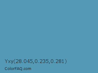 Yxy 28.045,0.235,0.281 Color is a normal blue color and the nearest color is Hippie Blue #589aaf. Hex code #5499b6 and RGB value is rgb(84,153,182). In RGB color space, this color is composed of 33% red, 60% green, 71% blue, In CMYK color space, this color is composed of 54% cyan, 16% magenta, 0% yellow , 29% black , In HSL color space, this color has a hue angle of 198° , 40% saturation and 52% lightness.