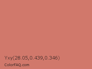 Yxy 28.05,0.439,0.346 Color is a light red color and the nearest color is Japonica #d87c63. Hex code #d1786b and RGB value is rgb(209,120,107). In RGB color space, this color is composed of 82% red, 47% green, 42% blue, In CMYK color space, this color is composed of 0% cyan, 43% magenta, 49% yellow , 18% black , In HSL color space, this color has a hue angle of 8° , 53% saturation and 62% lightness.