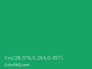 Yxy 28.076,0.264,0.457 Color is a normal green color and the nearest color is Green Crayola #1cac78. Hex code #17a566 and RGB value is rgb(23,165,102). In RGB color space, this color is composed of 9% red, 65% green, 40% blue, In CMYK color space, this color is composed of 86% cyan, 0% magenta, 38% yellow , 35% black , In HSL color space, this color has a hue angle of 153° , 76% saturation and 37% lightness.