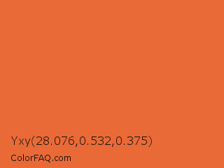 Yxy 28.076,0.532,0.375 Color is a normal orange color and the nearest color is Deep Carrot Orange #e9692c. Hex code #ea6a37 and RGB value is rgb(234,106,55). In RGB color space, this color is composed of 92% red, 42% green, 22% blue, In CMYK color space, this color is composed of 0% cyan, 55% magenta, 76% yellow , 8% black , In HSL color space, this color has a hue angle of 17° , 81% saturation and 57% lightness.
