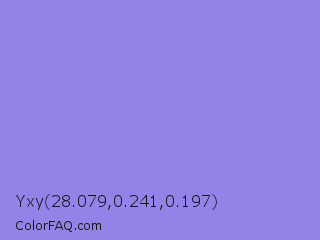 Yxy 28.079,0.241,0.197 Color is a light indigo color and the nearest color is Chetwode Blue #8581d9. Hex code #9183e8 and RGB value is rgb(145,131,232). In RGB color space, this color is composed of 57% red, 51% green, 91% blue, In CMYK color space, this color is composed of 38% cyan, 44% magenta, 0% yellow , 9% black , In HSL color space, this color has a hue angle of 248° , 69% saturation and 71% lightness.