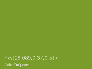 Yxy 28.089,0.37,0.51 Color is a normal lime color and the nearest color is Wasabi #788a25. Hex code #7a9c2b and RGB value is rgb(122,156,43). In RGB color space, this color is composed of 48% red, 61% green, 17% blue, In CMYK color space, this color is composed of 22% cyan, 0% magenta, 72% yellow , 39% black , In HSL color space, this color has a hue angle of 78° , 57% saturation and 39% lightness.