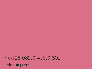 Yxy 28.089,0.416,0.301 Color is a light red color and the nearest color is Pale Red Violet #db7093. Hex code #d97087 and RGB value is rgb(217,112,135). In RGB color space, this color is composed of 85% red, 44% green, 53% blue, In CMYK color space, this color is composed of 0% cyan, 48% magenta, 38% yellow , 15% black , In HSL color space, this color has a hue angle of 347° , 58% saturation and 65% lightness.