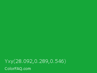 Yxy 28.092,0.289,0.546 Color is a normal green color and the nearest color is Green Pantone #00ad43. Hex code #15a739 and RGB value is rgb(21,167,57). In RGB color space, this color is composed of 8% red, 65% green, 22% blue, In CMYK color space, this color is composed of 87% cyan, 0% magenta, 66% yellow , 35% black , In HSL color space, this color has a hue angle of 135° , 78% saturation and 37% lightness.