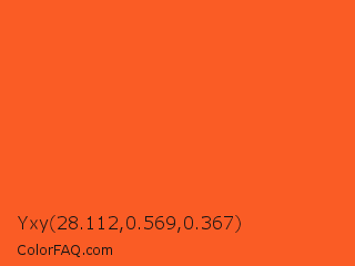 Yxy 28.112,0.569,0.367 Color is a normal color and the nearest color is Giants Orange #fe5a1d. Hex code #fa5c25 and RGB value is rgb(250,92,37). In RGB color space, this color is composed of 98% red, 36% green, 15% blue, In CMYK color space, this color is composed of 0% cyan, 63% magenta, 85% yellow , 2% black , In HSL color space, this color has a hue angle of 15° , 96% saturation and 56% lightness.