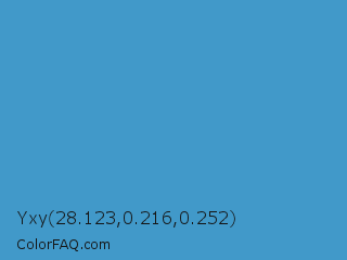 Yxy 28.123,0.216,0.252 Color is a normal blue color and the nearest color is Celestial Blue #4997d0. Hex code #4199c9 and RGB value is rgb(65,153,201). In RGB color space, this color is composed of 25% red, 60% green, 79% blue, In CMYK color space, this color is composed of 68% cyan, 24% magenta, 0% yellow , 21% black , In HSL color space, this color has a hue angle of 201° , 56% saturation and 52% lightness.