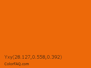 Yxy 28.127,0.558,0.392 Color is a normal orange color and the nearest color is Clementine #e96e00. Hex code #ed6909 and RGB value is rgb(237,105,9). In RGB color space, this color is composed of 93% red, 41% green, 4% blue, In CMYK color space, this color is composed of 0% cyan, 56% magenta, 96% yellow , 7% black , In HSL color space, this color has a hue angle of 25° , 93% saturation and 48% lightness.