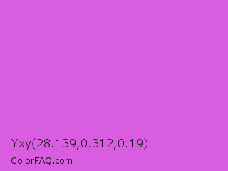 Yxy 28.139,0.312,0.19 Color is a light magenta color and the nearest color is Orchid #da70d6. Hex code #d95de0 and RGB value is rgb(217,93,224). In RGB color space, this color is composed of 85% red, 36% green, 88% blue, In CMYK color space, this color is composed of 3% cyan, 58% magenta, 0% yellow , 12% black , In HSL color space, this color has a hue angle of 297° , 68% saturation and 62% lightness.