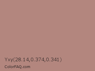 Yxy 28.14,0.374,0.341 Color is a normal red color and the nearest color is Brandy Rose #bb8983. Hex code #b3867e and RGB value is rgb(179,134,126). In RGB color space, this color is composed of 70% red, 53% green, 49% blue, In CMYK color space, this color is composed of 0% cyan, 25% magenta, 30% yellow , 30% black , In HSL color space, this color has a hue angle of 9° , 26% saturation and 60% lightness.