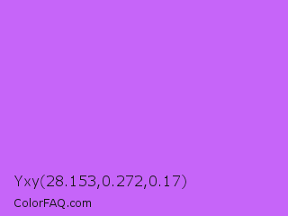 Yxy 28.153,0.272,0.17 Color is a light purple color and the nearest color is Heliotrope #df73ff. Hex code #c665f9 and RGB value is rgb(198,101,249). In RGB color space, this color is composed of 78% red, 40% green, 98% blue, In CMYK color space, this color is composed of 20% cyan, 59% magenta, 0% yellow , 2% black , In HSL color space, this color has a hue angle of 279° , 93% saturation and 69% lightness.