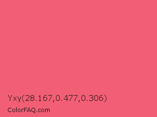 Yxy 28.167,0.477,0.306 Color is a light red color and the nearest color is Wild Watermelon #fd5b78. Hex code #f25e75 and RGB value is rgb(242,94,117). In RGB color space, this color is composed of 95% red, 37% green, 46% blue, In CMYK color space, this color is composed of 0% cyan, 61% magenta, 52% yellow , 5% black , In HSL color space, this color has a hue angle of 351° , 85% saturation and 66% lightness.