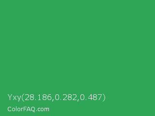 Yxy 28.186,0.282,0.487 Color is a normal green color and the nearest color is Chateau Green #40a860. Hex code #2fa556 and RGB value is rgb(47,165,86). In RGB color space, this color is composed of 18% red, 65% green, 34% blue, In CMYK color space, this color is composed of 72% cyan, 0% magenta, 48% yellow , 35% black , In HSL color space, this color has a hue angle of 140° , 56% saturation and 42% lightness.
