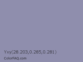 Yxy 28.203,0.285,0.281 Color is a light indigo color and the nearest color is Cool Grey #8c92ac. Hex code #8f8ead and RGB value is rgb(143,142,173). In RGB color space, this color is composed of 56% red, 56% green, 68% blue, In CMYK color space, this color is composed of 17% cyan, 18% magenta, 0% yellow , 32% black , In HSL color space, this color has a hue angle of 242° , 16% saturation and 62% lightness.