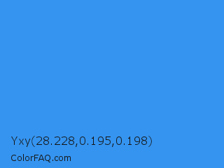 Yxy 28.228,0.195,0.198 Color is a normal blue color and the nearest color is Bleu De France #318ce7. Hex code #3594f0 and RGB value is rgb(53,148,240). In RGB color space, this color is composed of 21% red, 58% green, 94% blue, In CMYK color space, this color is composed of 78% cyan, 38% magenta, 0% yellow , 6% black , In HSL color space, this color has a hue angle of 210° , 86% saturation and 57% lightness.