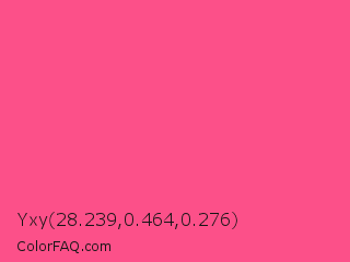 Yxy 28.239,0.464,0.276 Color is a light rose color and the nearest color is French Rose #f64a8a. Hex code #fc5089 and RGB value is rgb(252,80,137). In RGB color space, this color is composed of 99% red, 31% green, 54% blue, In CMYK color space, this color is composed of 0% cyan, 68% magenta, 46% yellow , 1% black , In HSL color space, this color has a hue angle of 340° , 97% saturation and 65% lightness.