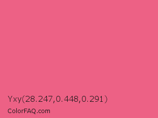 Yxy 28.247,0.448,0.291 Color is a light red color and the nearest color is Dark Pink #e75480. Hex code #ed6185 and RGB value is rgb(237,97,133). In RGB color space, this color is composed of 93% red, 38% green, 52% blue, In CMYK color space, this color is composed of 0% cyan, 59% magenta, 44% yellow , 7% black , In HSL color space, this color has a hue angle of 345° , 80% saturation and 65% lightness.