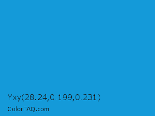 Yxy 28.24,0.199,0.231 Color is a normal blue color and the nearest color is Rich Electric Blue #0892d0. Hex code #149ad9 and RGB value is rgb(20,154,217). In RGB color space, this color is composed of 8% red, 60% green, 85% blue, In CMYK color space, this color is composed of 91% cyan, 29% magenta, 0% yellow , 15% black , In HSL color space, this color has a hue angle of 199° , 83% saturation and 46% lightness.