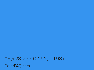 Yxy 28.255,0.195,0.198 Color is a normal blue color and the nearest color is Bleu De France #318ce7. Hex code #3594f0 and RGB value is rgb(53,148,240). In RGB color space, this color is composed of 21% red, 58% green, 94% blue, In CMYK color space, this color is composed of 78% cyan, 38% magenta, 0% yellow , 6% black , In HSL color space, this color has a hue angle of 210° , 86% saturation and 57% lightness.