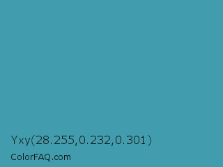 Yxy 28.255,0.232,0.301 Color is a normal cyan color and the nearest color is Boston Blue #3b91b4. Hex code #419dad and RGB value is rgb(65,157,173). In RGB color space, this color is composed of 25% red, 62% green, 68% blue, In CMYK color space, this color is composed of 62% cyan, 9% magenta, 0% yellow , 32% black , In HSL color space, this color has a hue angle of 189° , 45% saturation and 47% lightness.