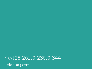 Yxy 28.261,0.236,0.344 Color is a normal cyan color and the nearest color is Zomp #39a78e. Hex code #29a199 and RGB value is rgb(41,161,153). In RGB color space, this color is composed of 16% red, 63% green, 60% blue, In CMYK color space, this color is composed of 75% cyan, 0% magenta, 5% yellow , 37% black , In HSL color space, this color has a hue angle of 176° , 59% saturation and 40% lightness.