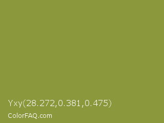 Yxy 28.272,0.381,0.475 Color is a normal yellow color and the nearest color is Sycamore #908d39. Hex code #8b983c and RGB value is rgb(139,152,60). In RGB color space, this color is composed of 55% red, 60% green, 24% blue, In CMYK color space, this color is composed of 9% cyan, 0% magenta, 61% yellow , 40% black , In HSL color space, this color has a hue angle of 68° , 43% saturation and 42% lightness.