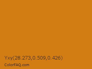 Yxy 28.273,0.509,0.426 Color is a normal orange color and the nearest color is Meteor #d07d12. Hex code #d17d13 and RGB value is rgb(209,125,19). In RGB color space, this color is composed of 82% red, 49% green, 7% blue, In CMYK color space, this color is composed of 0% cyan, 40% magenta, 91% yellow , 18% black , In HSL color space, this color has a hue angle of 33° , 83% saturation and 45% lightness.