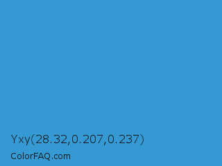 Yxy 28.32,0.207,0.237 Color is a normal blue color and the nearest color is Curious Blue #2596d1. Hex code #3599d4 and RGB value is rgb(53,153,212). In RGB color space, this color is composed of 21% red, 60% green, 83% blue, In CMYK color space, this color is composed of 75% cyan, 28% magenta, 0% yellow , 17% black , In HSL color space, this color has a hue angle of 202° , 65% saturation and 52% lightness.