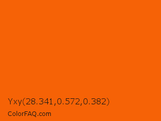 Yxy 28.341,0.572,0.382 Color is a normal orange color and the nearest color is Vivid Orange #ff5f00. Hex code #f66206 and RGB value is rgb(246,98,6). In RGB color space, this color is composed of 96% red, 38% green, 2% blue, In CMYK color space, this color is composed of 0% cyan, 60% magenta, 98% yellow , 4% black , In HSL color space, this color has a hue angle of 23° , 95% saturation and 49% lightness.