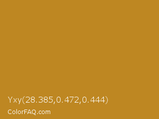 Yxy 28.385,0.472,0.444 Color is a normal orange color and the nearest color is University Of California Gold #b78727. Hex code #be8722 and RGB value is rgb(190,135,34). In RGB color space, this color is composed of 75% red, 53% green, 13% blue, In CMYK color space, this color is composed of 0% cyan, 29% magenta, 82% yellow , 25% black , In HSL color space, this color has a hue angle of 39° , 70% saturation and 44% lightness.