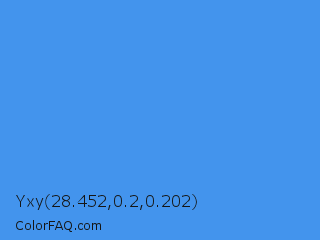 Yxy 28.452,0.2,0.202 Color is a normal blue color and the nearest color is Tufts Blue #3e8ede. Hex code #4394ed and RGB value is rgb(67,148,237). In RGB color space, this color is composed of 26% red, 58% green, 93% blue, In CMYK color space, this color is composed of 72% cyan, 38% magenta, 0% yellow , 7% black , In HSL color space, this color has a hue angle of 211° , 83% saturation and 60% lightness.