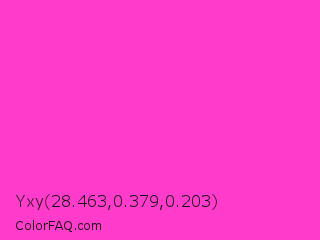Yxy 28.463,0.379,0.203 Color is a light magenta color and the nearest color is Razzle Dazzle Rose #ff33cc. Hex code #fe3bca and RGB value is rgb(254,59,202). In RGB color space, this color is composed of 100% red, 23% green, 79% blue, In CMYK color space, this color is composed of 0% cyan, 77% magenta, 20% yellow , 0% black , In HSL color space, this color has a hue angle of 316° , 99% saturation and 61% lightness.