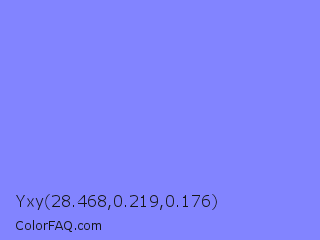 Yxy 28.468,0.219,0.176 Color is a light blue color and the nearest color is Portage #8b9fee. Hex code #8284ff and RGB value is rgb(130,132,255). In RGB color space, this color is composed of 51% red, 52% green, 100% blue, In CMYK color space, this color is composed of 49% cyan, 48% magenta, 0% yellow , 0% black , In HSL color space, this color has a hue angle of 239° , 100% saturation and 75% lightness.