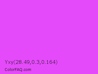 Yxy 28.49,0.3,0.164 Color is a light magenta color and the nearest color is Pink Flamingo Crayola #ff66ff. Hex code #e54afa and RGB value is rgb(229,74,250). In RGB color space, this color is composed of 90% red, 29% green, 98% blue, In CMYK color space, this color is composed of 8% cyan, 70% magenta, 0% yellow , 2% black , In HSL color space, this color has a hue angle of 293° , 95% saturation and 64% lightness.