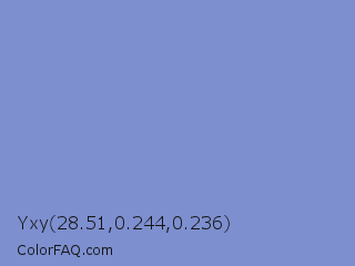 Yxy 28.51,0.244,0.236 Color is a light blue color and the nearest color is Dark Pastel Blue #779ecb. Hex code #7d8fcf and RGB value is rgb(125,143,207). In RGB color space, this color is composed of 49% red, 56% green, 81% blue, In CMYK color space, this color is composed of 40% cyan, 31% magenta, 0% yellow , 19% black , In HSL color space, this color has a hue angle of 227° , 46% saturation and 65% lightness.