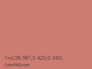 Yxy 28.587,0.425,0.343 Color is a light red color and the nearest color is Contessa #c6726b. Hex code #cd7c71 and RGB value is rgb(205,124,113). In RGB color space, this color is composed of 80% red, 49% green, 44% blue, In CMYK color space, this color is composed of 0% cyan, 40% magenta, 45% yellow , 20% black , In HSL color space, this color has a hue angle of 7° , 48% saturation and 62% lightness.