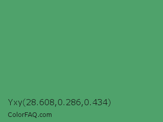 Yxy 28.608,0.286,0.434 Color is a normal green color and the nearest color is Fruit Salad #4f9d5d. Hex code #4fa26b and RGB value is rgb(79,162,107). In RGB color space, this color is composed of 31% red, 64% green, 42% blue, In CMYK color space, this color is composed of 51% cyan, 0% magenta, 34% yellow , 36% black , In HSL color space, this color has a hue angle of 140° , 34% saturation and 47% lightness.