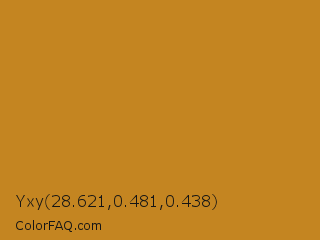 Yxy 28.621,0.481,0.438 Color is a normal orange color and the nearest color is Brandy Punch #cd8429. Hex code #c48521 and RGB value is rgb(196,133,33). In RGB color space, this color is composed of 77% red, 52% green, 13% blue, In CMYK color space, this color is composed of 0% cyan, 32% magenta, 83% yellow , 23% black , In HSL color space, this color has a hue angle of 37° , 71% saturation and 45% lightness.