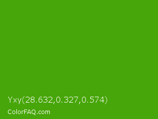 Yxy 28.632,0.327,0.574 Color is a normal green color and the nearest color is Kelly Green #4cbb17. Hex code #47a609 and RGB value is rgb(71,166,9). In RGB color space, this color is composed of 28% red, 65% green, 4% blue, In CMYK color space, this color is composed of 57% cyan, 0% magenta, 95% yellow , 35% black , In HSL color space, this color has a hue angle of 96° , 90% saturation and 34% lightness.