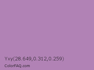 Yxy 28.649,0.312,0.259 Color is a light magenta color and the nearest color is African Violet #b284be. Hex code #b182b5 and RGB value is rgb(177,130,181). In RGB color space, this color is composed of 69% red, 51% green, 71% blue, In CMYK color space, this color is composed of 2% cyan, 28% magenta, 0% yellow , 29% black , In HSL color space, this color has a hue angle of 295° , 26% saturation and 61% lightness.