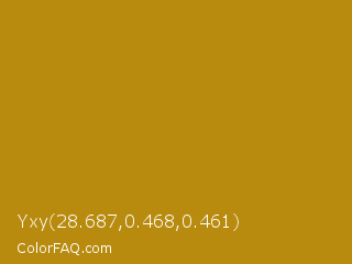 Yxy 28.687,0.468,0.461 Color is a normal orange color and the nearest color is Dark Goldenrod #b8860b. Hex code #b88b0e and RGB value is rgb(184,139,14). In RGB color space, this color is composed of 72% red, 55% green, 5% blue, In CMYK color space, this color is composed of 0% cyan, 24% magenta, 92% yellow , 28% black , In HSL color space, this color has a hue angle of 44° , 86% saturation and 39% lightness.