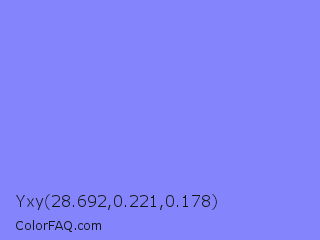 Yxy 28.692,0.221,0.178 Color is a light blue color and the nearest color is Portage #8b9fee. Hex code #8485fd and RGB value is rgb(132,133,253). In RGB color space, this color is composed of 52% red, 52% green, 99% blue, In CMYK color space, this color is composed of 48% cyan, 47% magenta, 0% yellow , 1% black , In HSL color space, this color has a hue angle of 240° , 97% saturation and 75% lightness.