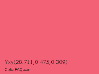 Yxy 28.711,0.475,0.309 Color is a light red color and the nearest color is Wild Watermelon #fd5b78. Hex code #f26175 and RGB value is rgb(242,97,117). In RGB color space, this color is composed of 95% red, 38% green, 46% blue, In CMYK color space, this color is composed of 0% cyan, 60% magenta, 52% yellow , 5% black , In HSL color space, this color has a hue angle of 352° , 85% saturation and 66% lightness.