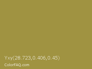 Yxy 28.723,0.406,0.45 Color is a normal yellow color and the nearest color is Sycamore #908d39. Hex code #a09341 and RGB value is rgb(160,147,65). In RGB color space, this color is composed of 63% red, 58% green, 25% blue, In CMYK color space, this color is composed of 0% cyan, 8% magenta, 59% yellow , 37% black , In HSL color space, this color has a hue angle of 52° , 42% saturation and 44% lightness.