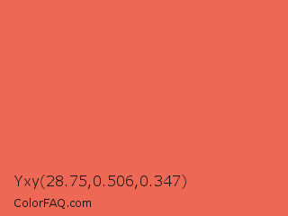 Yxy 28.75,0.506,0.347 Color is a light red color and the nearest color is Burnt Sienna #e97451. Hex code #ee6856 and RGB value is rgb(238,104,86). In RGB color space, this color is composed of 93% red, 41% green, 34% blue, In CMYK color space, this color is composed of 0% cyan, 56% magenta, 64% yellow , 7% black , In HSL color space, this color has a hue angle of 7° , 82% saturation and 64% lightness.