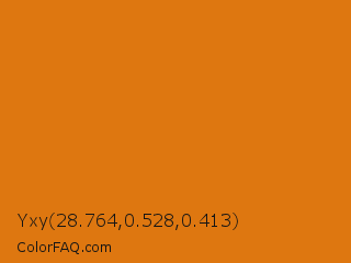 Yxy 28.764,0.528,0.413 Color is a normal orange color and the nearest color is Christine #e7730a. Hex code #de7710 and RGB value is rgb(222,119,16). In RGB color space, this color is composed of 87% red, 47% green, 6% blue, In CMYK color space, this color is composed of 0% cyan, 46% magenta, 93% yellow , 13% black , In HSL color space, this color has a hue angle of 30° , 87% saturation and 47% lightness.