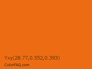 Yxy 28.77,0.552,0.393 Color is a normal orange color and the nearest color is Christine #e7730a. Hex code #ed6c13 and RGB value is rgb(237,108,19). In RGB color space, this color is composed of 93% red, 42% green, 7% blue, In CMYK color space, this color is composed of 0% cyan, 54% magenta, 92% yellow , 7% black , In HSL color space, this color has a hue angle of 24° , 86% saturation and 50% lightness.